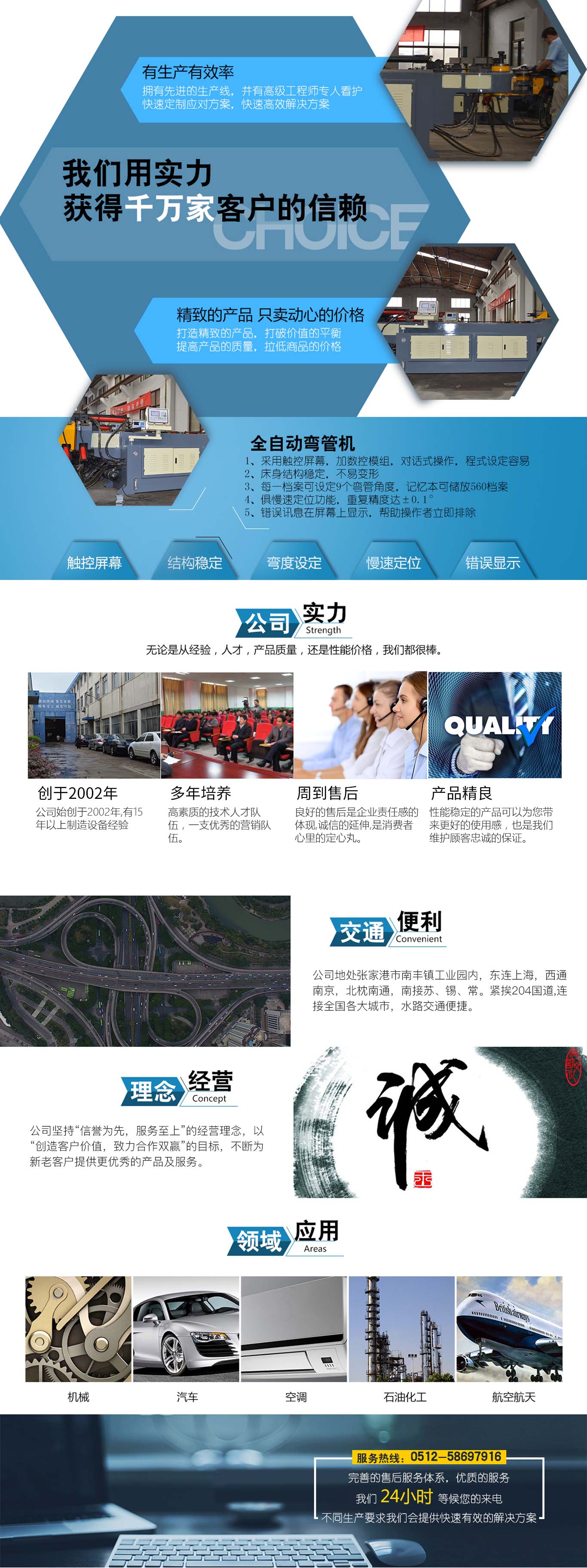 張家港市雙和機(jī)械制造有限公司始建于2001年,占地面積12000平方米,南鄰蘇州、無錫、上海,東鄰常州、南京,交通便利,位長三角中間地段,風(fēng)景優(yōu)美的張家港。 雙和公司至創(chuàng)立開始,引進(jìn)了國外的設(shè)計制造理念,組建了企業(yè)生產(chǎn)管理優(yōu)秀團(tuán)隊(duì),致力于管材加工機(jī)械研發(fā)、設(shè)計、制造。創(chuàng)新的設(shè)計理念,嚴(yán)格的質(zhì)量把關(guān),專業(yè)的售后服務(wù),不斷提升了我在整個行業(yè)的影響力。 雙和公司生產(chǎn)的系列產(chǎn)品分為彎管機(jī)、切管機(jī)、縮管機(jī)、磨齒機(jī)、伺服彎管機(jī)、數(shù)控彎管機(jī)、液壓彎管機(jī)、自動切管機(jī)、管端成型機(jī)、倒角機(jī)、大弧滾圓機(jī)、鋁切機(jī)、壓彎機(jī)等管材加工機(jī)械,廣泛用于航天業(yè)、造船業(yè)、汽車制造、鍋爐制造、自行車、摩托車、體育健身器材、管制品家...